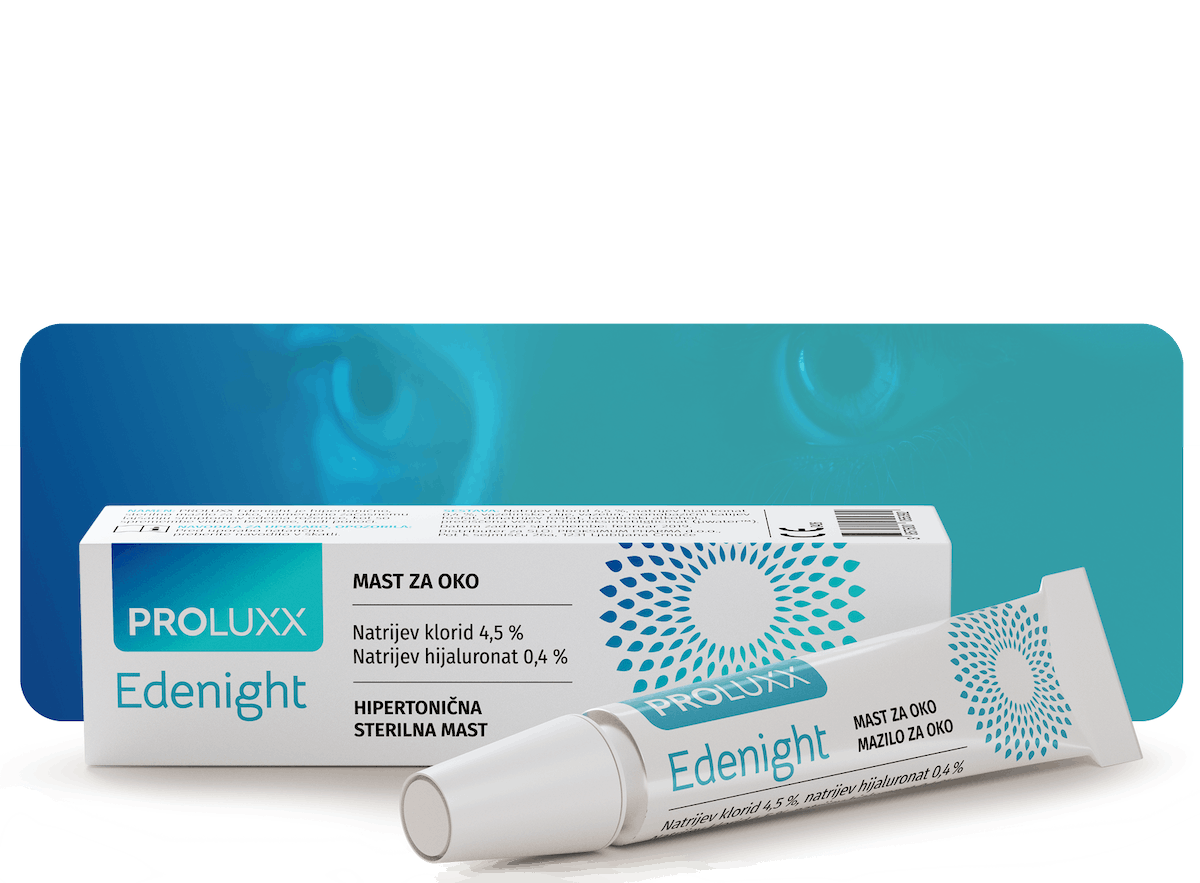 PROLUXX Edenight je sterilno hipertonično mazilo za oko, namenjeno začasnemu blaženju simptomov edema roženice, kot so spremembe vida in bolečina, tudi ponoči.